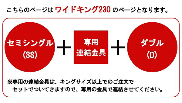 サイズ■フレーム寸法/W約241×L210×H45cmMH約19cm■マットレス寸法/W約90+140×L195×H17cm仕様■本体主材/プリント化粧板、合成皮革、白熱灯(10W)1灯、1口コンセント(1200W)■マットレス主材/2.1mmボンネルコイルスプリング(コイル数270+390個)、2.2mmポケットコイルスプリング(コイル数92+104個)、ウレタン、フェルト、ポリエステル、両面多針キルティング加工梱包サイズ本体・サイドフレーム・床板:W97×L24×H50cm本体・サイドフレーム・床板:W147×L24×H50cm連結金具:W13×L13×H3.5cmマットレス:W92×L34×H34cmマットレス:W142×L34×H34cm生産国■本体/日本 ■マットレス/中国注意※実際の商品の色にできるだけ近づけるよう撮影を行なっておりますが、商品の色はご使用のモニターによって実際の明るさや色と多少異なって見える場合がございます。