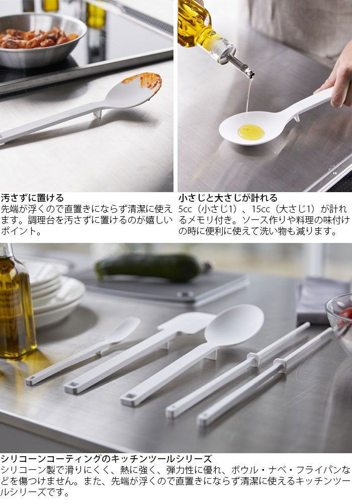 スプーンには大さじ・小さじの目盛り付きで、油や調味料を量るのに便利。